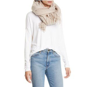 Soft and wispy fringe frames an ultralightweight and versatile scarf woven from pure modal.